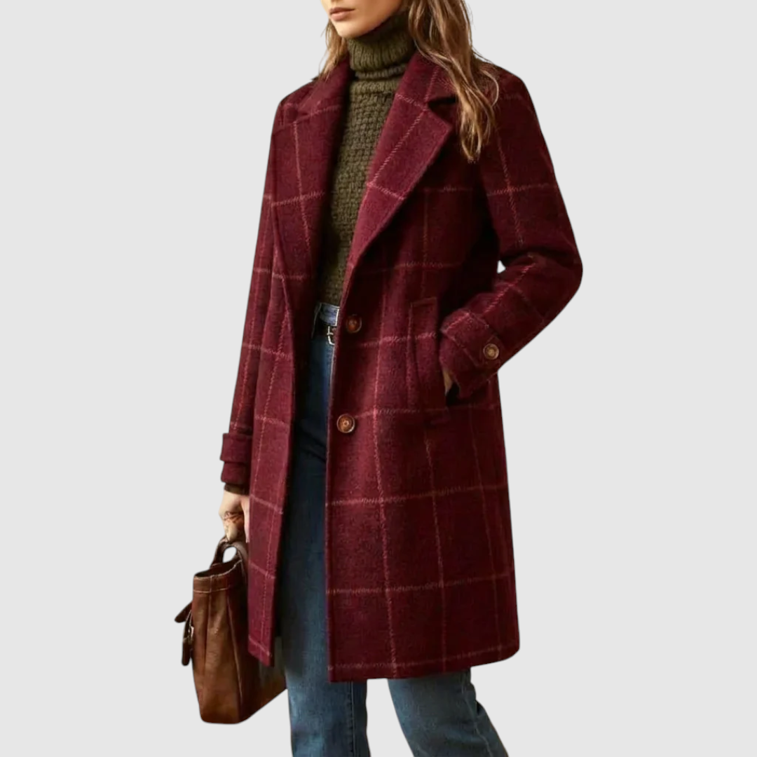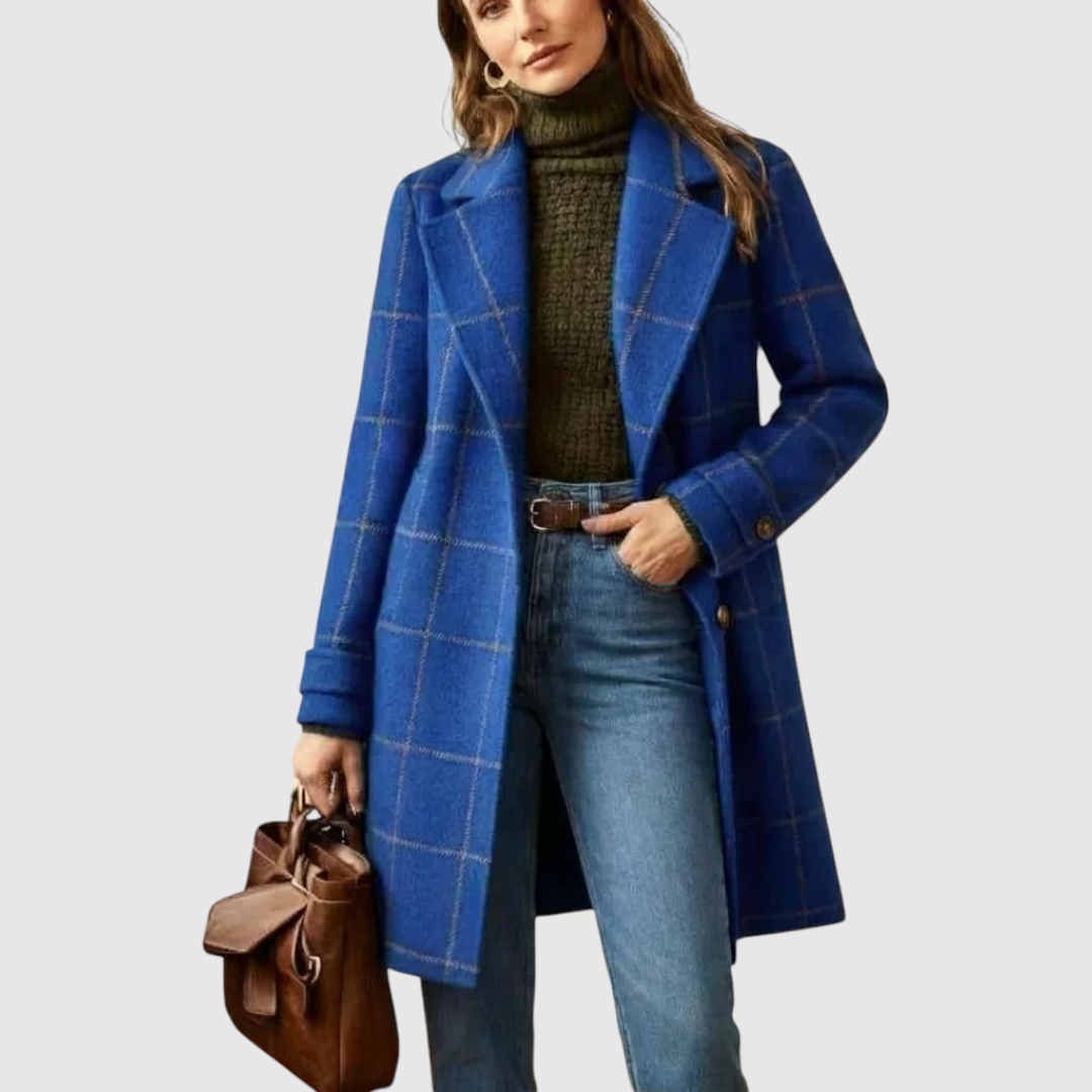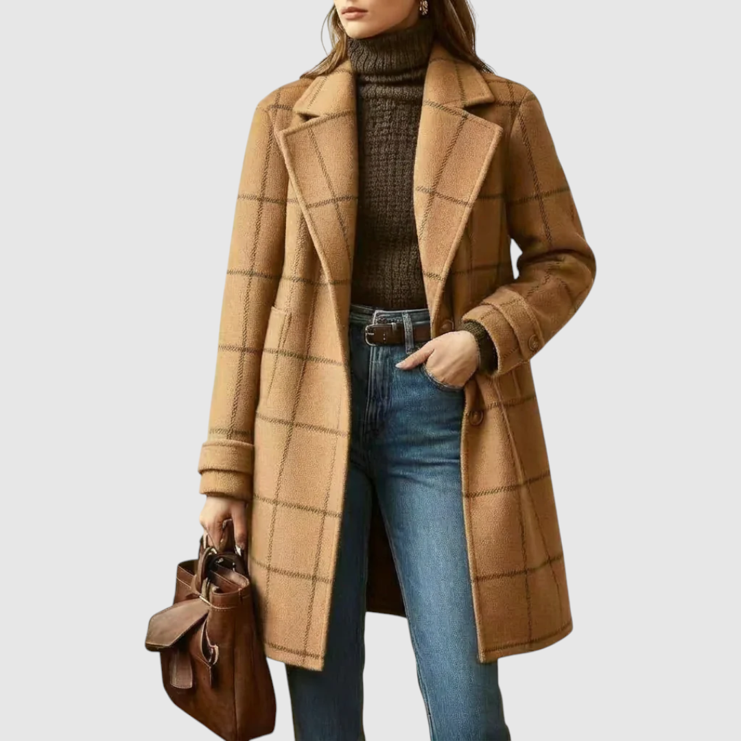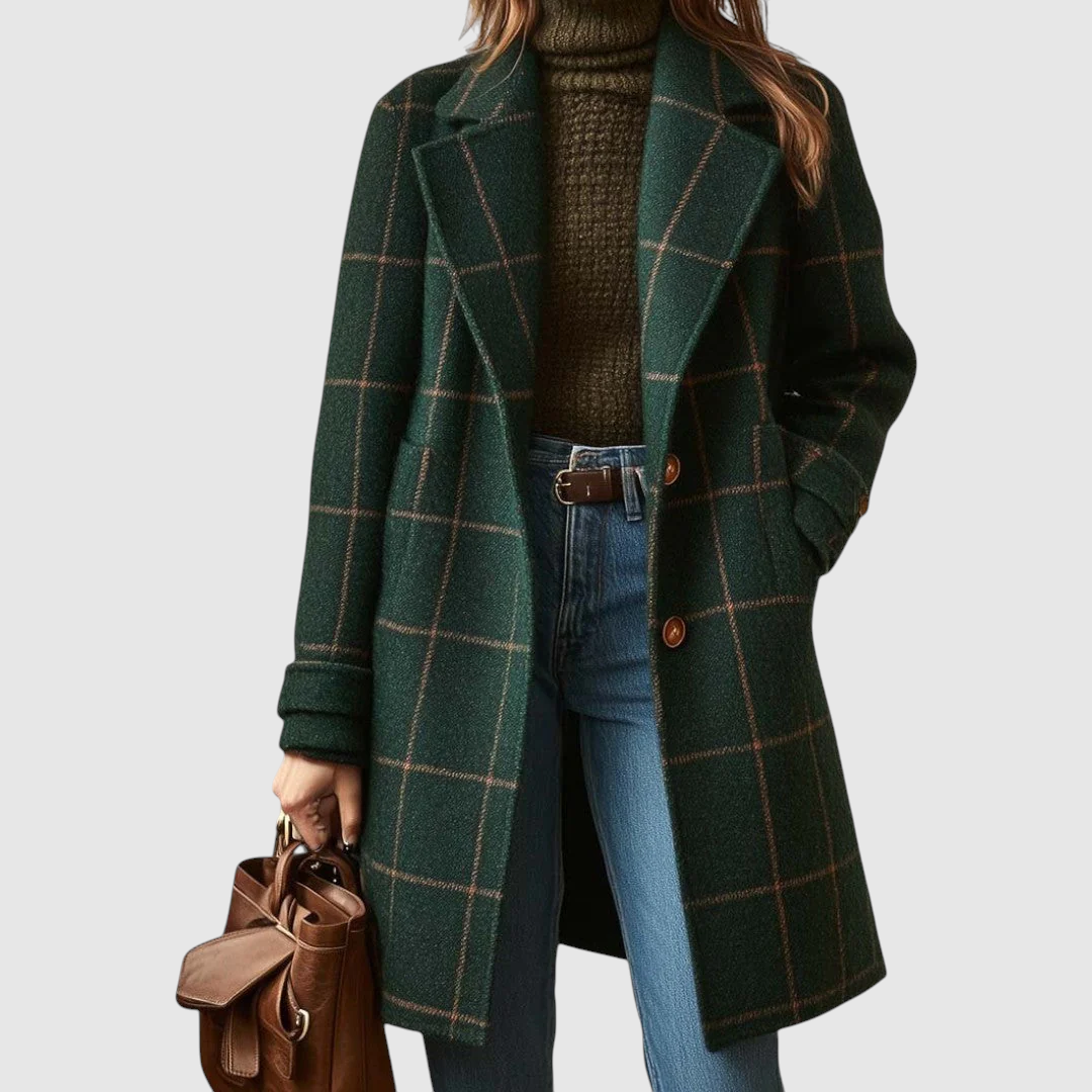 Un palton clasic cu model în carouri, creat pentru a oferi ținutelor zilnice un aer elegant, bine definit și potrivit sezonului rece.