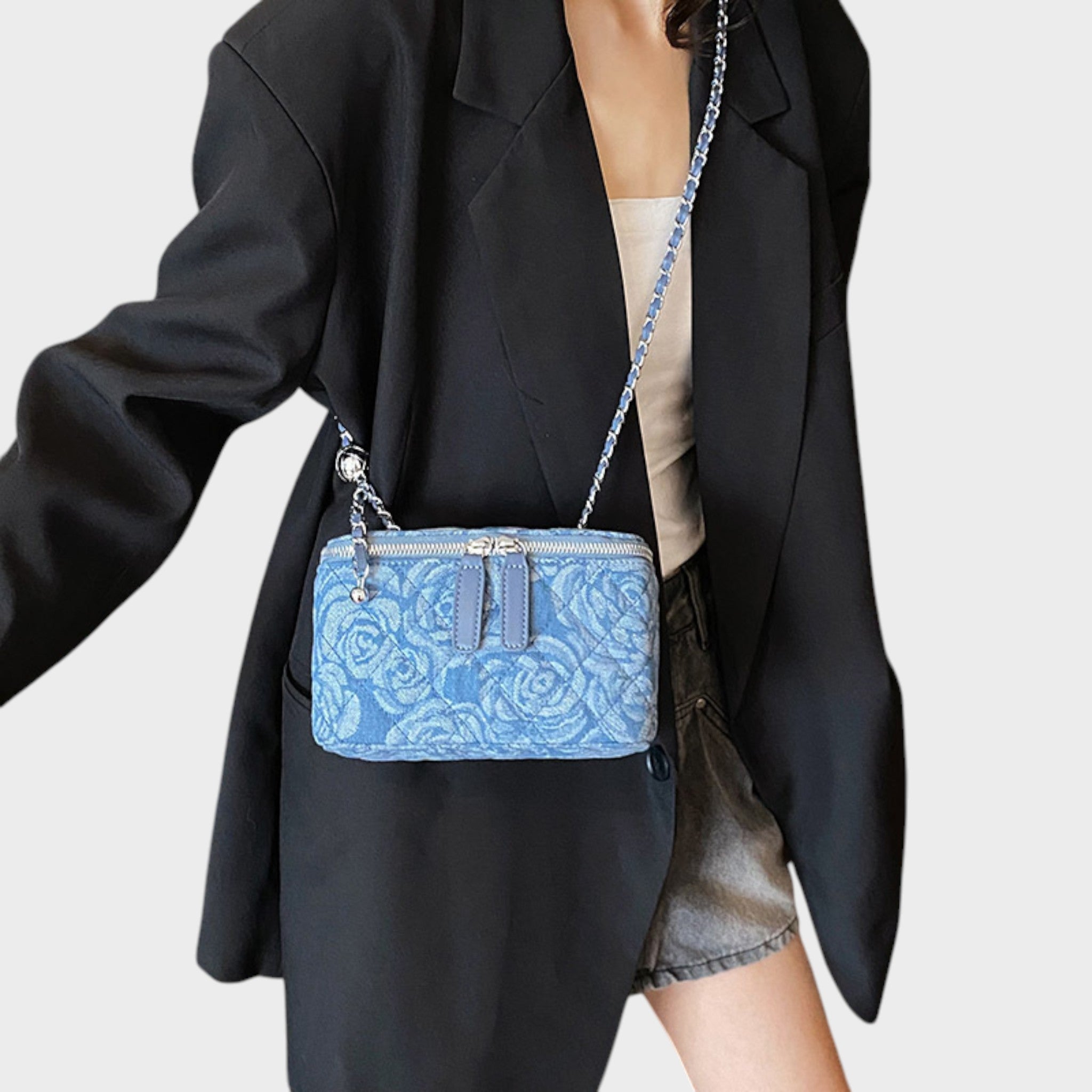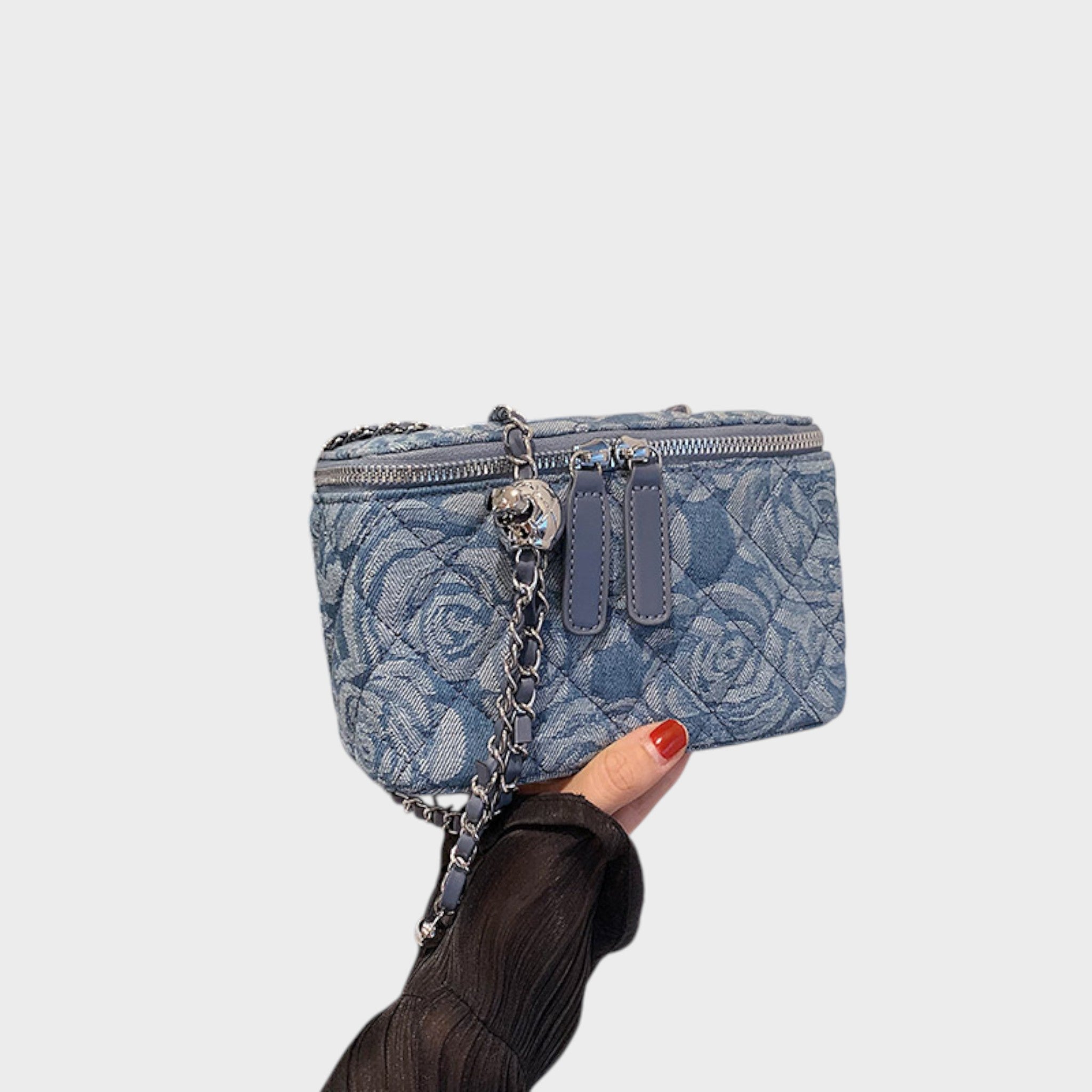 Această geantă este alegerea perfectă pentru cei care iubesc stilul cu o nuanță romantică. Cu un motiv floral reliefat și un finisaj textil rafinat, aduce un aspect ușor, creativ și feminin. Forma sa structurată și mânerul cu lanț oferă un echilibru între lejeritate și eleganță, făcând-o un accesoriu unic care subliniază personalitatea dumneavoastră în orice ocazie.