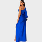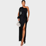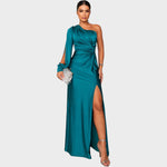 Această rochie de seară emană rafinament și un design modern. Croiul asimetric cu un umăr și detaliul plisat efectuos în talie subliniază silueta feminină, în timp ce decupajul adânc adaugă o doză de senzualitate și eleganță. Este ideală pentru ocazii festive, cine de gală sau evenimente speciale, la care doriți să străluciți și să lăsați o impresie de neuitat.